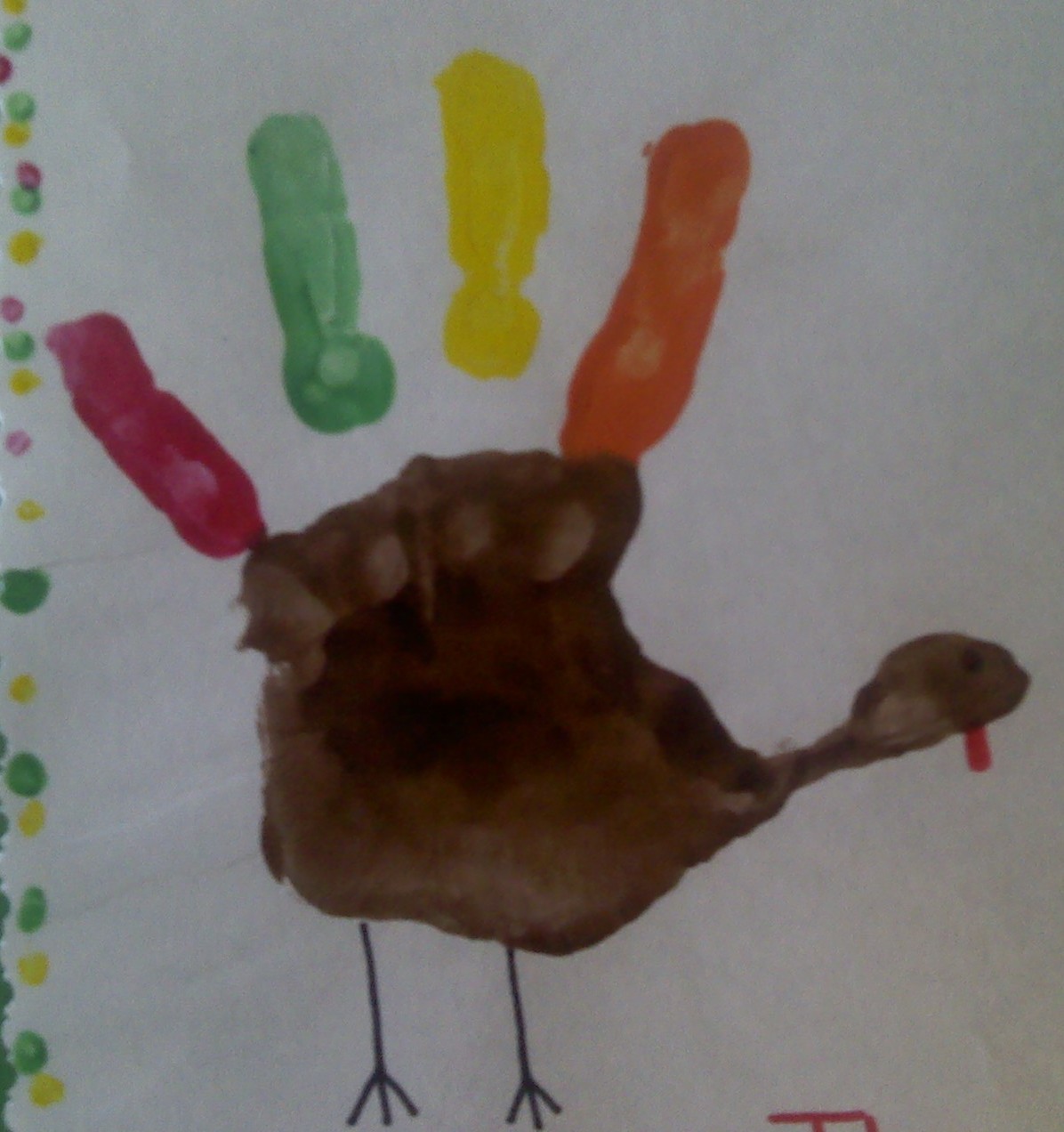To make this Thanksgiving decoration, paint a paper plate yellow, allow to dry then paint the child's hand (see below) and press down in the middle of the plate. Child can decorate edges with various fall colors and add a googly eye and legs. Use a hole puncher to punch two holes at the top and thread yarn through to hang.